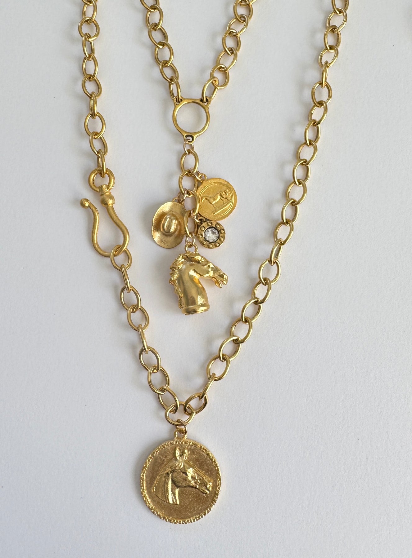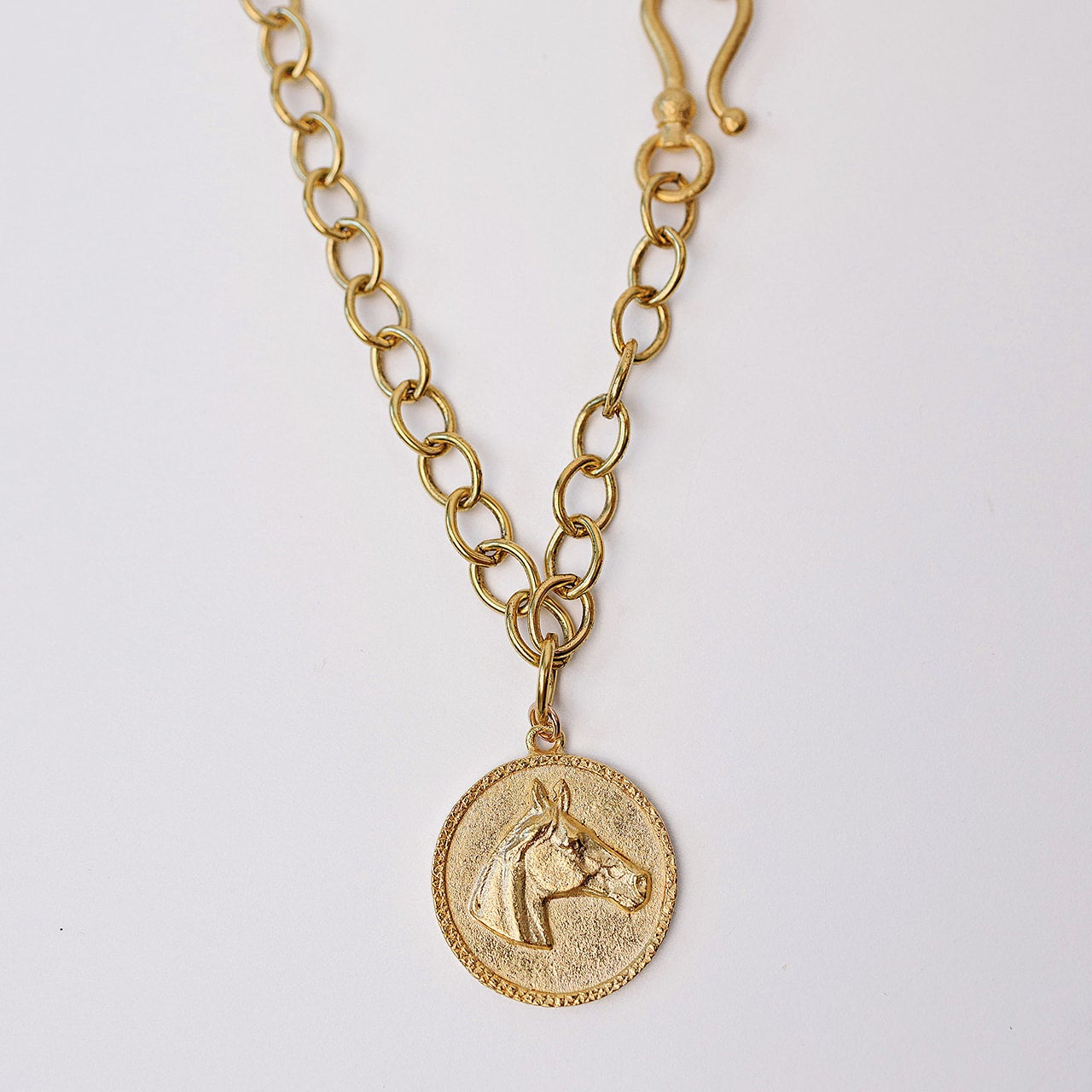 The Gold Stallion Necklace. Gold horse pendant on a large link statement chain. Hook clasp on the side.