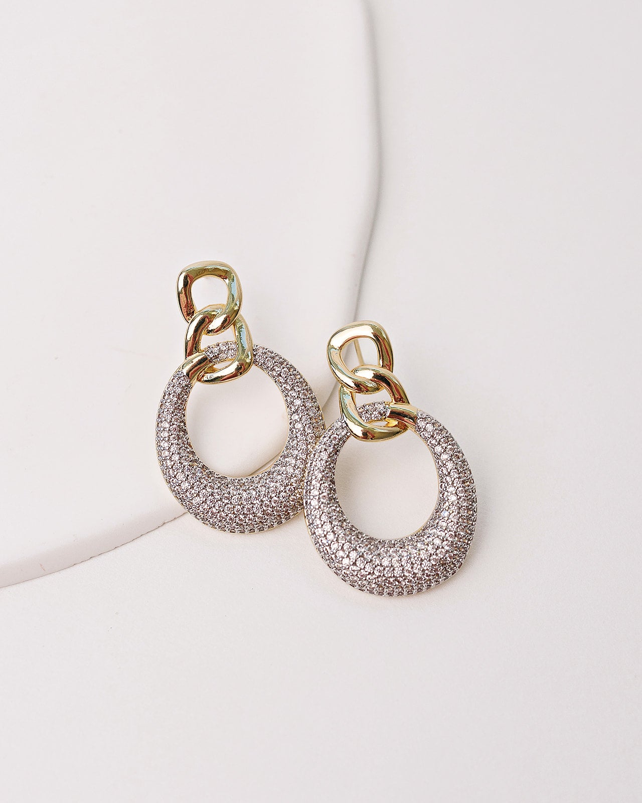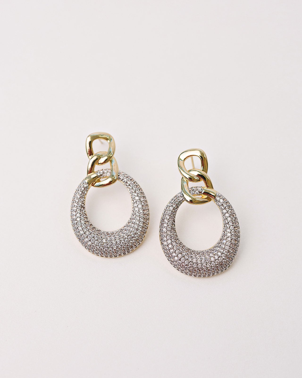 Margo Earrings. Mixed metal. Pave cz in a silver setting with gold chain accents. Very light weight.