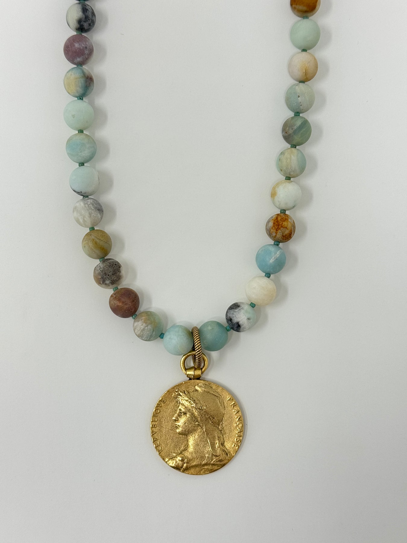 Roam Necklace.  Green amazonite round stones  with a French coin replica pendant.